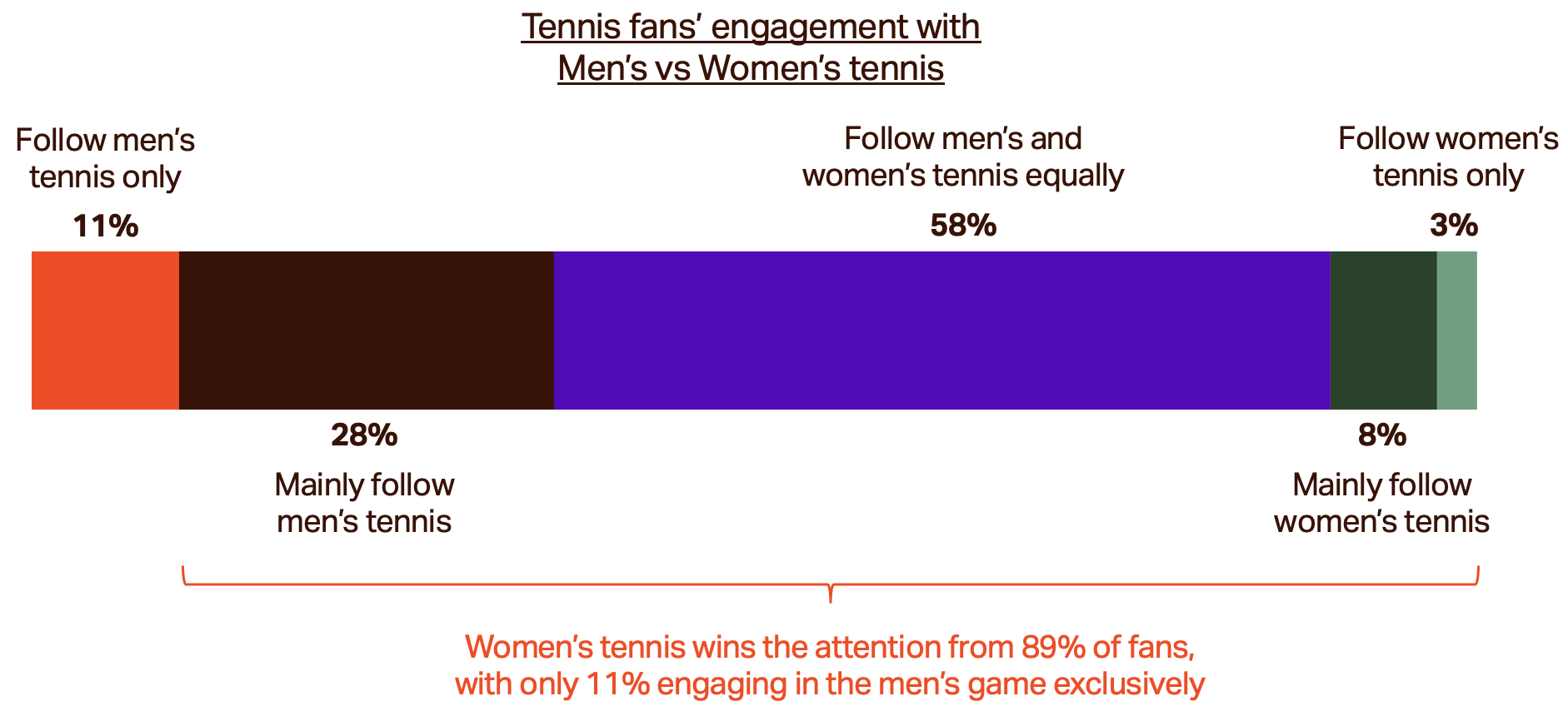 Our recent survey of UK sports fans tells us tennis is one of the few sports where interest across men’s and women’s matches is almost equal. Of those surveyed, 89% of tennis fans said they watch both men’s and women’s matches, and three in five said they watch women’s tennis as much as the men’s game.
