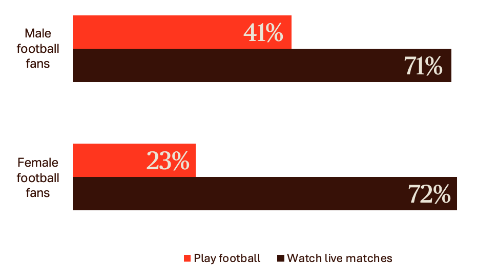 While women’s sports is making fan engagement more accessible through the launch of tournaments like The Hundred and the airing of major events like the Euros on free-to-view channels, it’s participating in sport where the substantial gender gap emerges. Male and female football fans watch live matches to an equal extent, yet the proportion of male fans taking part is significantly higher than the number of female fans who play.