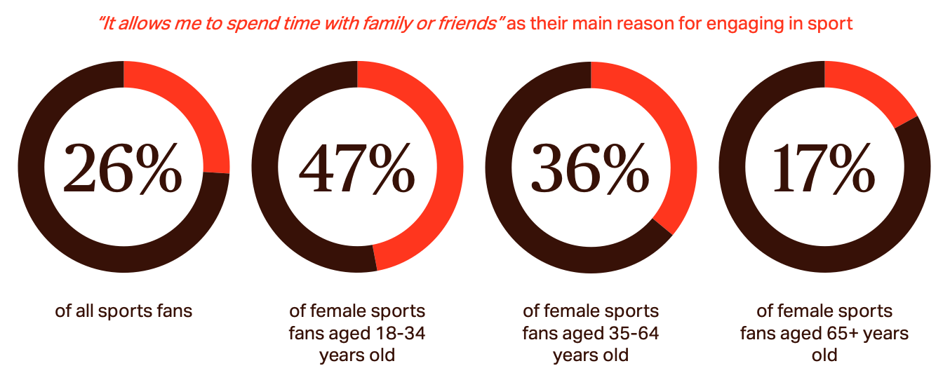Social disconnection is prevalent and increasing among young adults. The World Happiness Report states that almost one in five young adults across the world feel they have no one they can count on for social support – a 39% increase compared to 2006. The apps designed to bring us together are likely making many less able to socialise in person, which tells us the role of socialising has never been more important. What’s more, our survey results show that socialising is a key motivator for engaging with sport, especially amongst younger female fans.