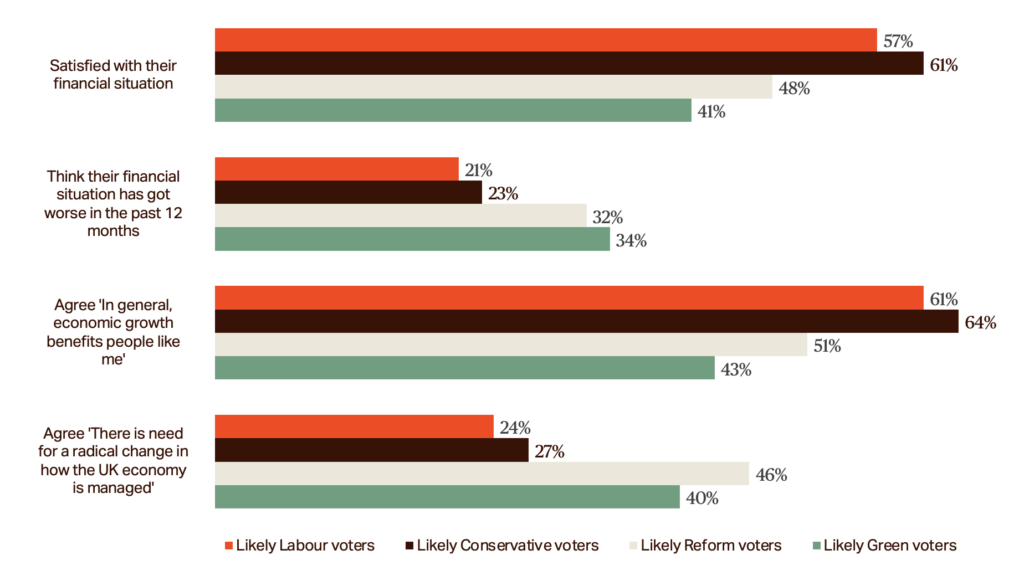 The common thread uniting these disparate voters is a profound crisis of economic faith. Our data shows that many supporters of both the Greens and Reform UK are fundamentally dissatisfied with their financial situation and are significantly more likely than Labour or Conservative voters to believe growth in the economy will not benefit ‘people like me’. They don’t want steady management; they demand radical change.