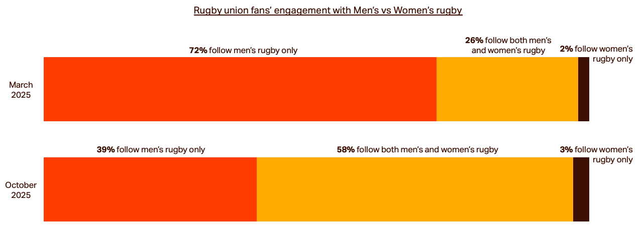 The 2025 Women’s Rugby World Cup sparked a remarkable shift in engagement with women’s rugby. While the number of UK adults engaging with rugby union overall hasn’t changed significantly, the percentage of rugby union fans following women’s rugby has jumped from 28% to 61% in the space of six months.